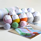 Select the colours you want from the swatches above. For the blanket shown we have used Light Grey as the background colour and Bright Pink, Hot Yellow, Soft Blue, Bright Green, Warm Pink, Orange and Turquoise as the stripe and pom pom colours.