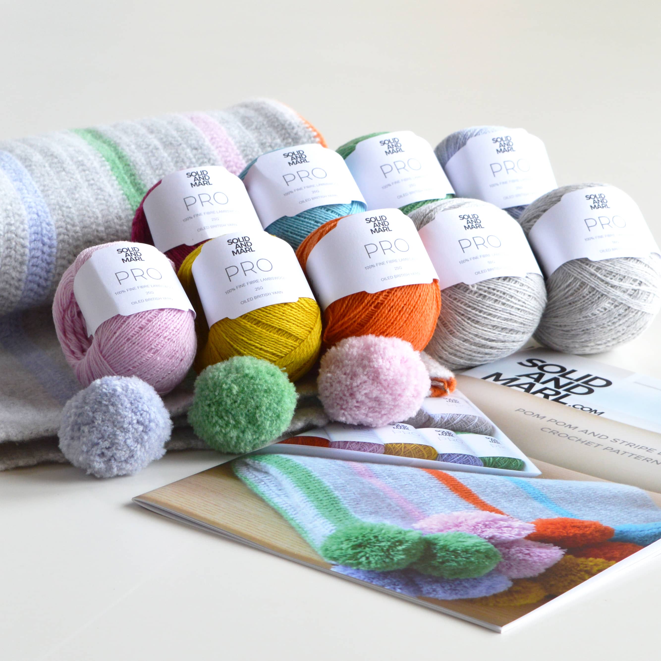 Learn to crochet kit, this Pom Pom blanket kit is perfect for beginners. The kit includes everything you need, pure soft lambswool, crochet hook and easy to follow pattern with pictures and diagrams.