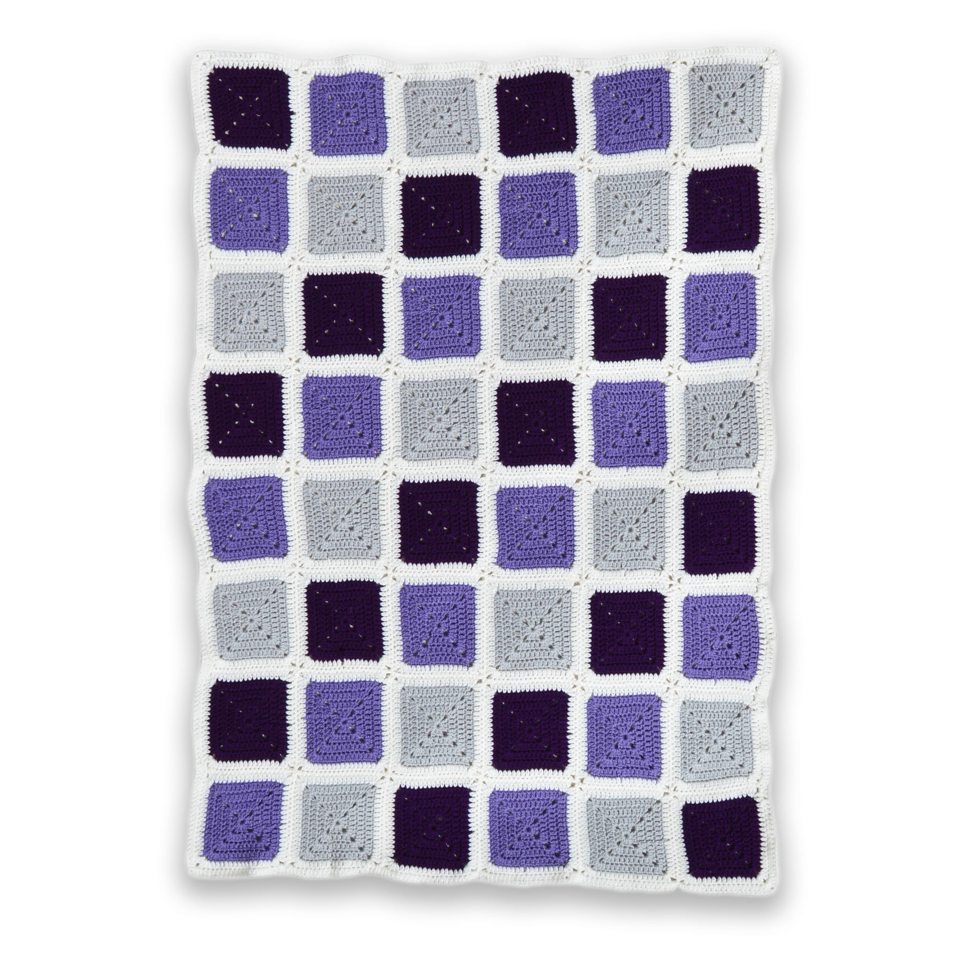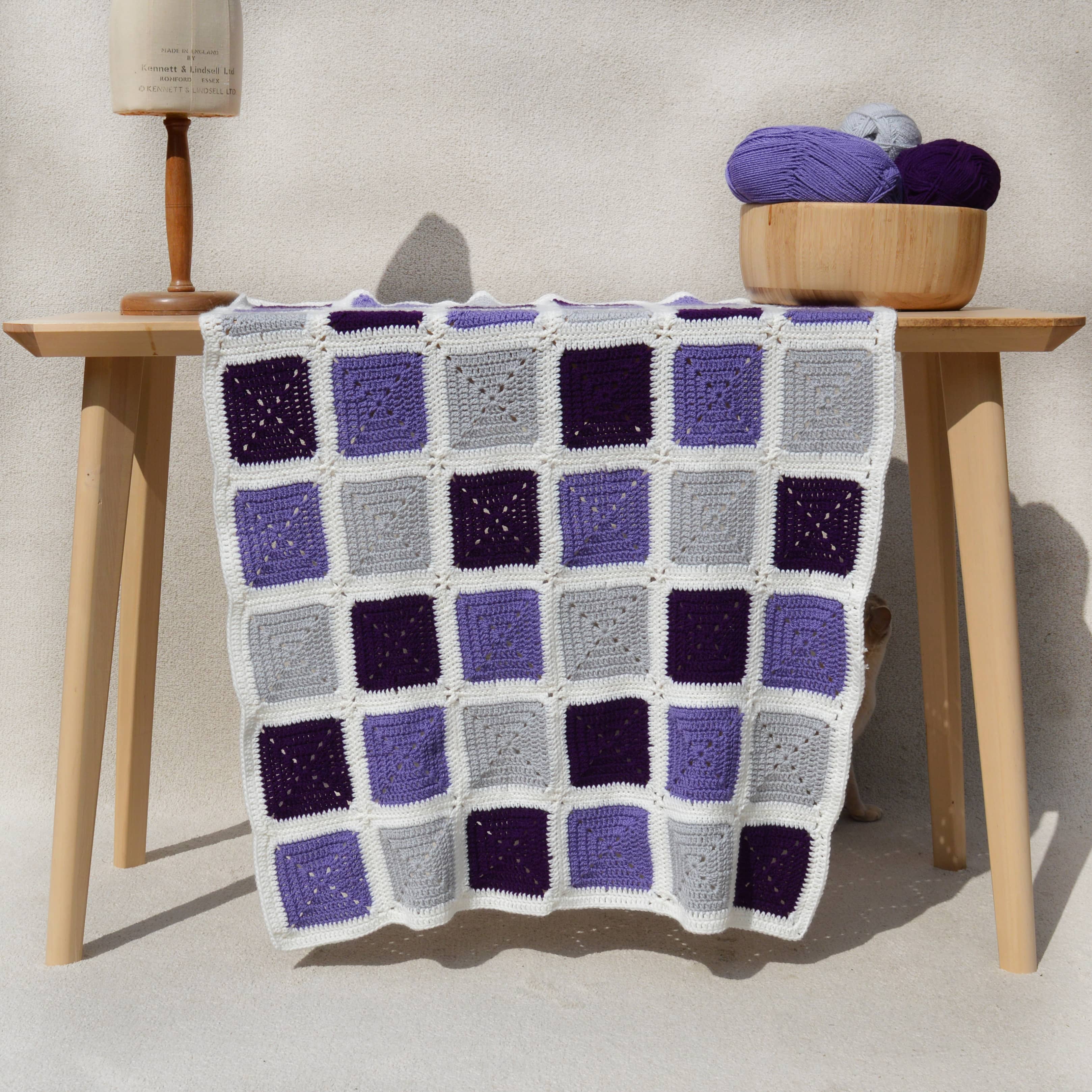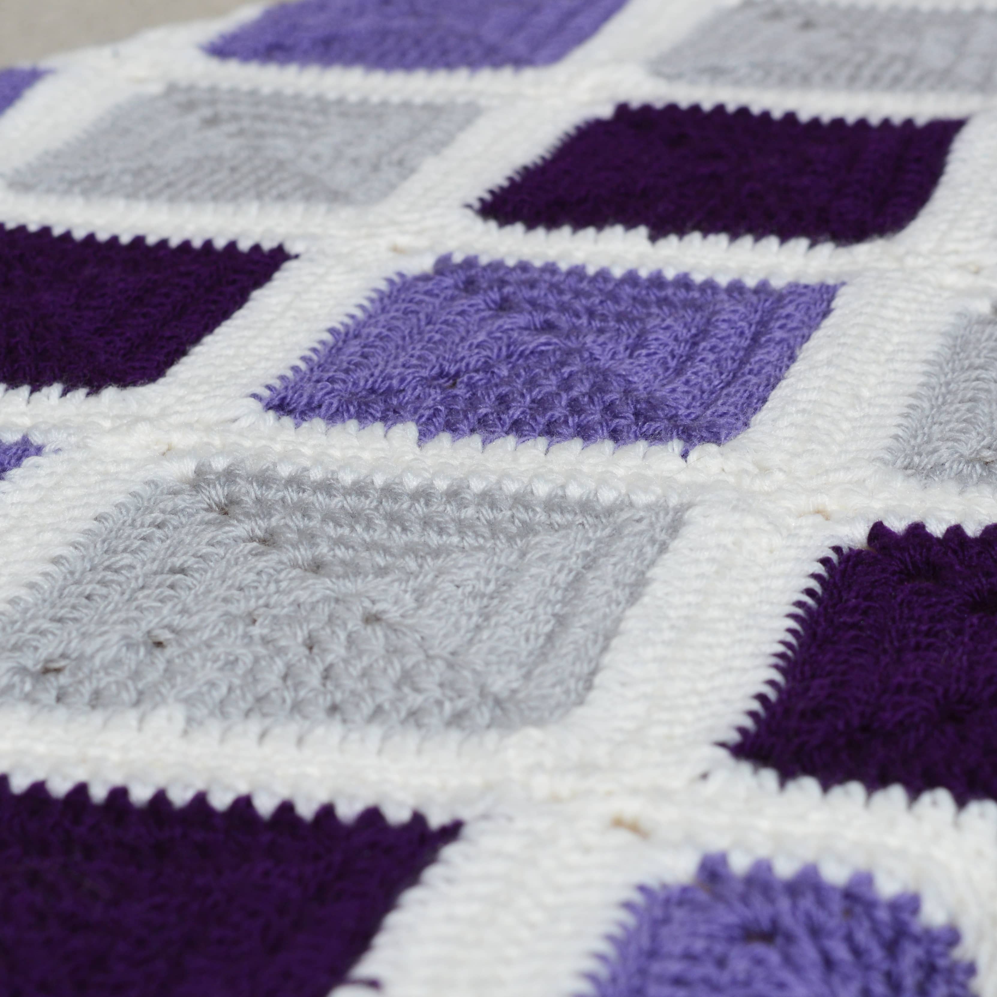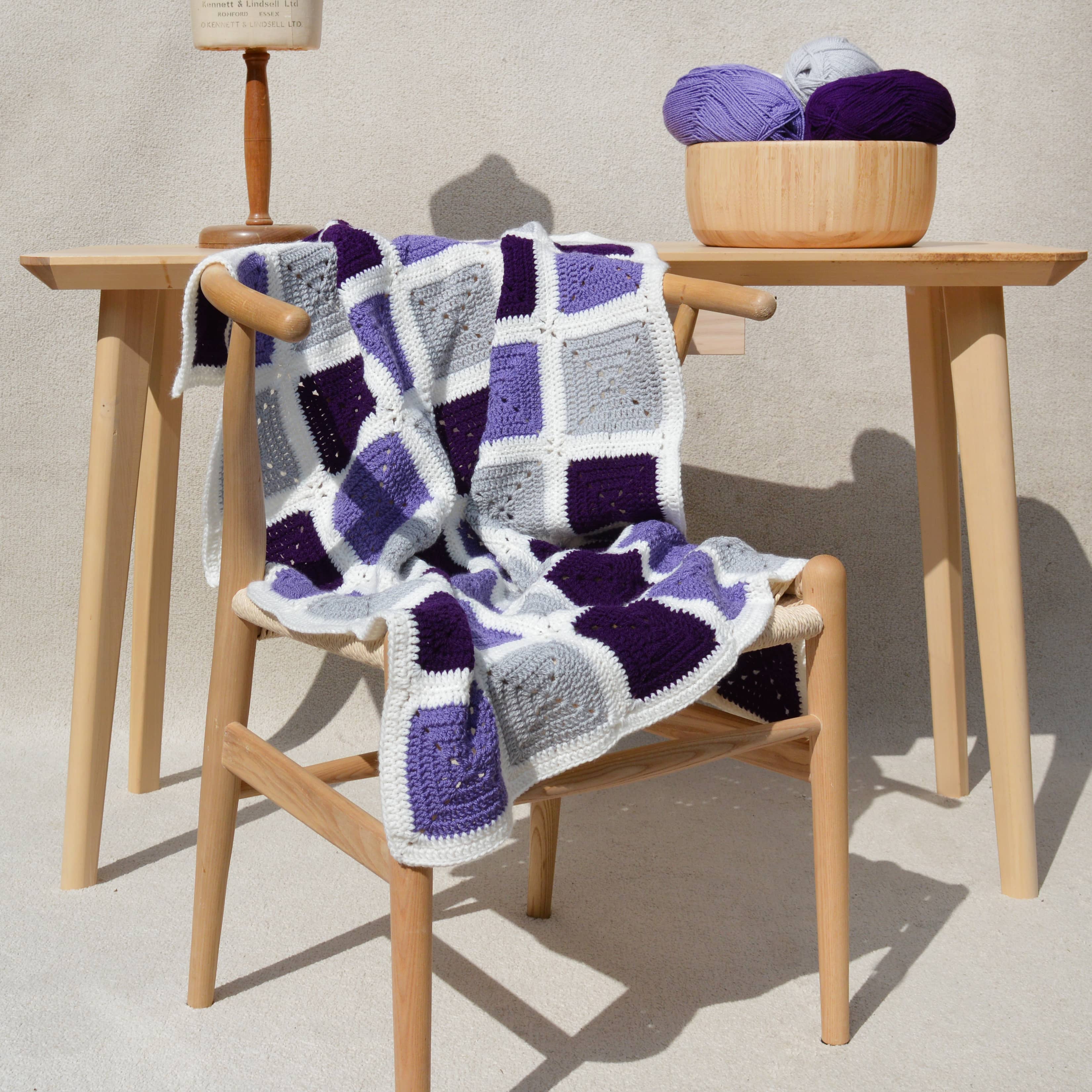 The blanket is made up by crocheting granny squares and attaching them together. With vibrant purple and grey on a white background this blanket will brighten up any room.