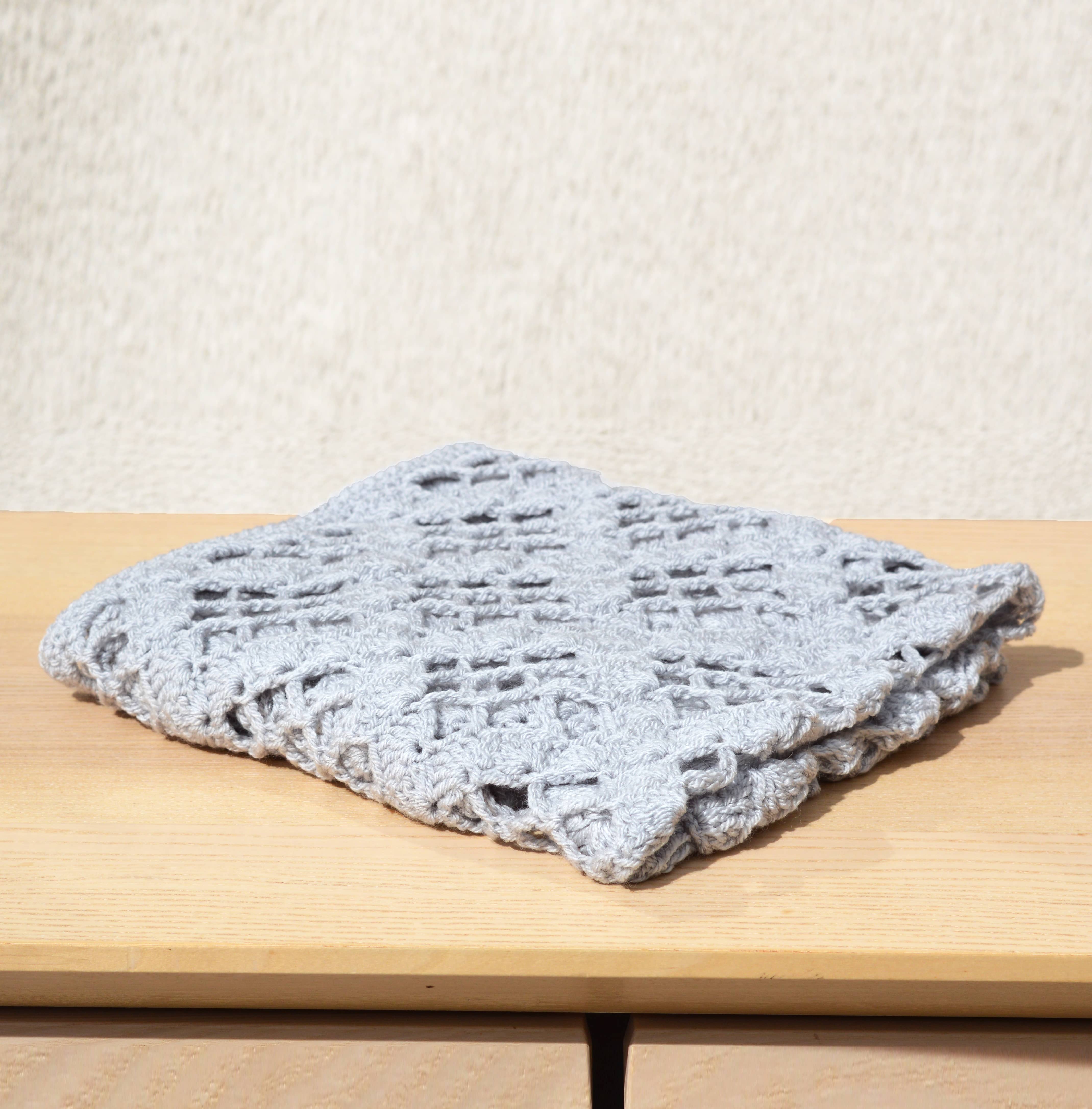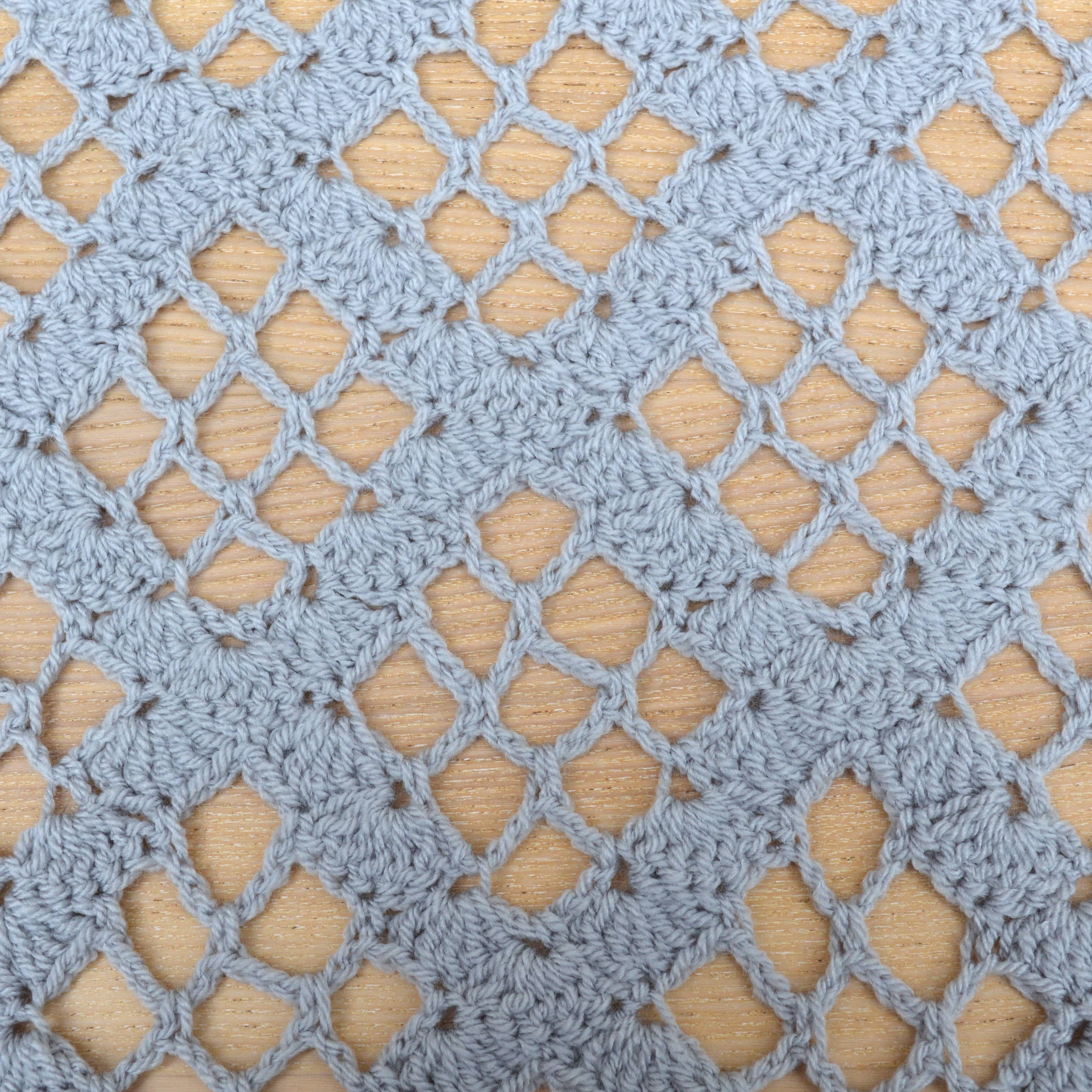This blanket is crocheted in one piece and has a stunning diamond lace pattern all over. Light weight and cosy, perfect for a summer evening or a night in by the fire.